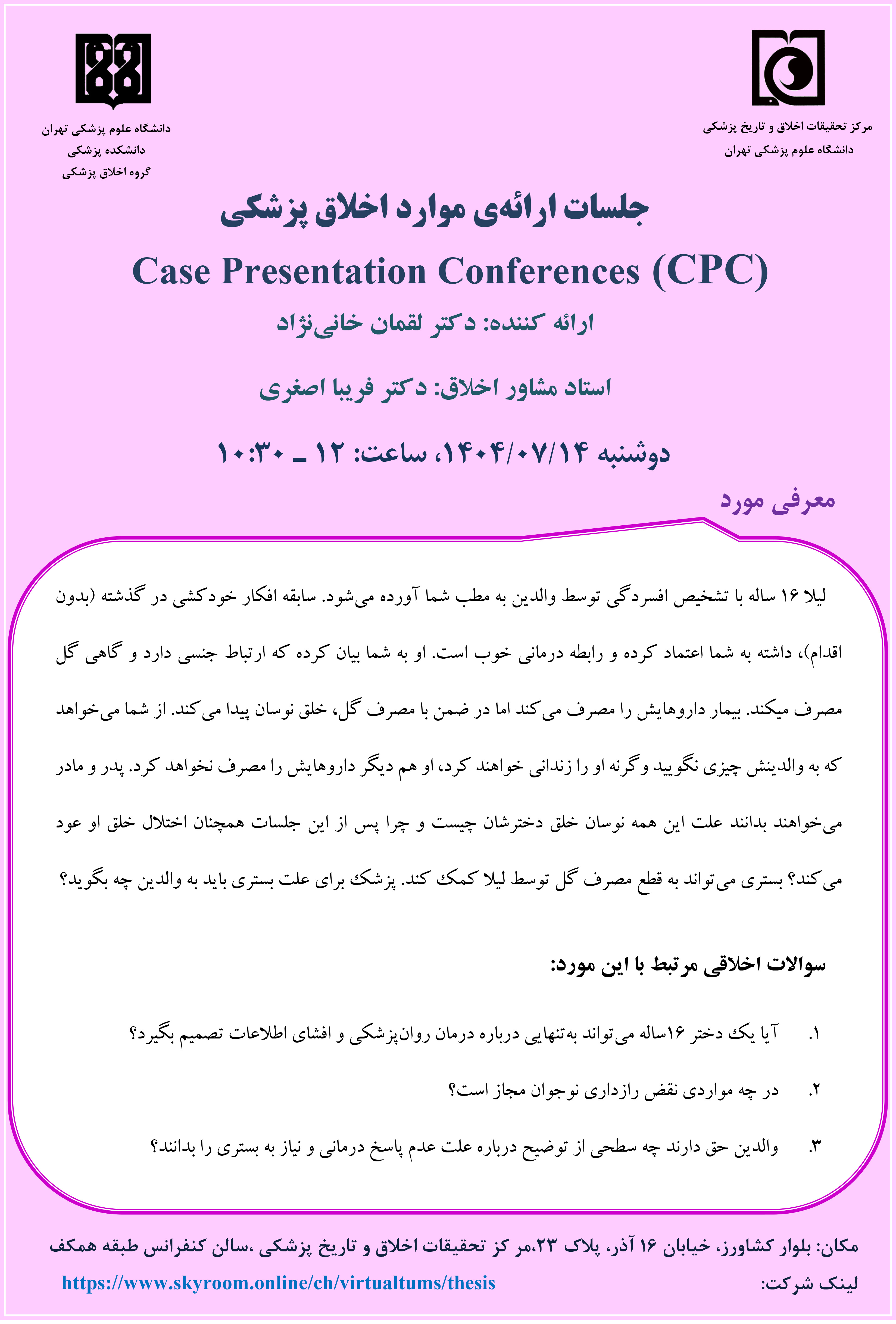 It is announced that the CPC Session will be held at "Medical Ethics and History of Medicine Research Center" From 10:30 to 12 On Monday, October 6th, 2025.